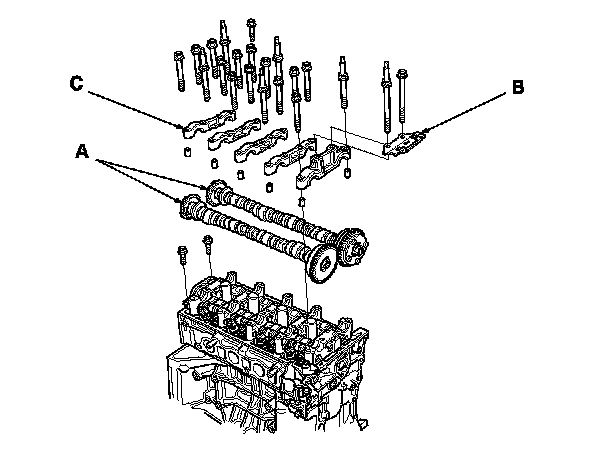 7. Set the camshaft holders (C) and the cam chain guide B in place.