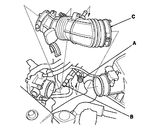 3. Disconnect the vacuum hose (A) and the breather pipe (B), then remove the intake air duct (C).