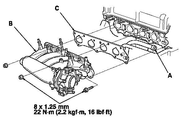 1. Connect the water bypass hose (A) to the intake manifold (B), then install the intake manifold with a new gasket (C), and tighten the bolts and the nuts in a crisscross pattern in three steps, beginning with the inner bolt.
