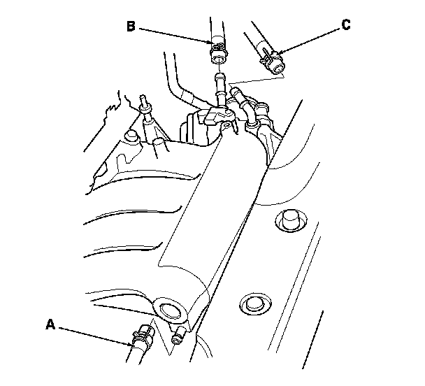 8. Connect the positive crankcase ventilation (PCV) hose (A), the evaporative emission (EVAP) canister hose (B), and the brake booster vacuum hose (C).