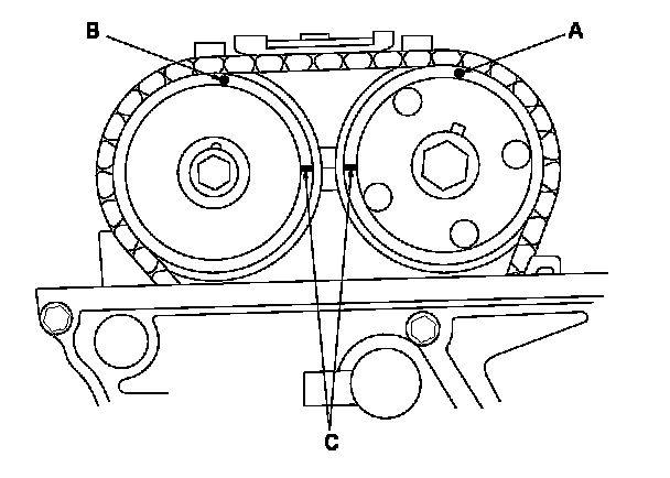 6. Set the No. 1 piston at top dead center (TDC). The punch mark (A) on the variable valve timing control (VTC) actuator and the punch mark (B) on the exhaust camshaft sprocket should be at the top. Align the TDC marks (C) on the VTC actuator and the exhaust camshaft sprocket.