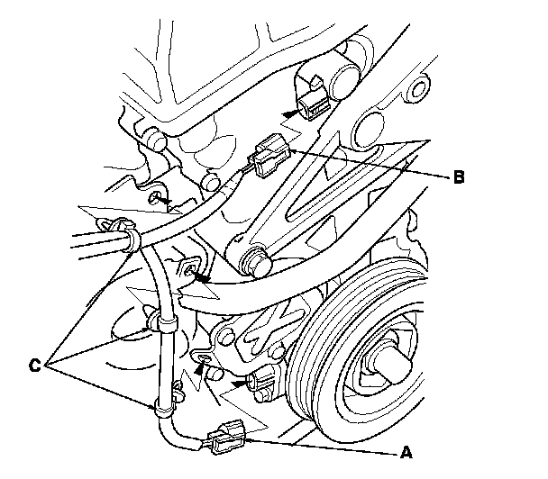 8. Disconnect the crankshaft position (CKP) sensor connector (A) and the VTC oil control solenoid valve connector (B) and remove the harness clamps (C).