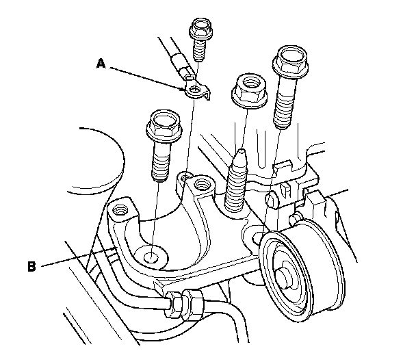 13. Remove the ground cable (A), then remove the side engine mount bracket (B).