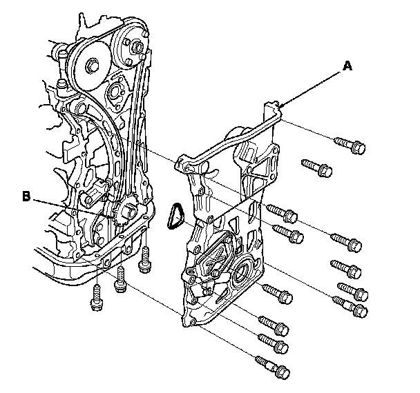 15. Remove the cam chain case (A), then remove the CKP pulse plate (B).