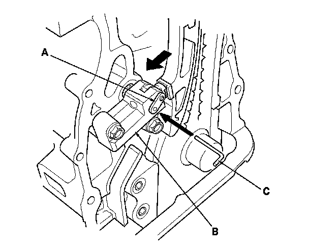 18. Align the holes on the lock (A) and the auto-tensioner (B), then insert a 1.2 mm (0.05 in.) diameter pin or lock pin (P/N 14511-PNA-003) (C) into the holes. Turn the crankshaft clockwise to secure the pin.
