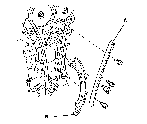 22. Remove cam chain guide A and the tensioner arm (B).