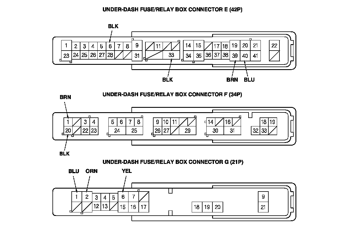 6. Reconnect the connectors to the under-dash fuse/relay box, and do these input tests at the following connectors.