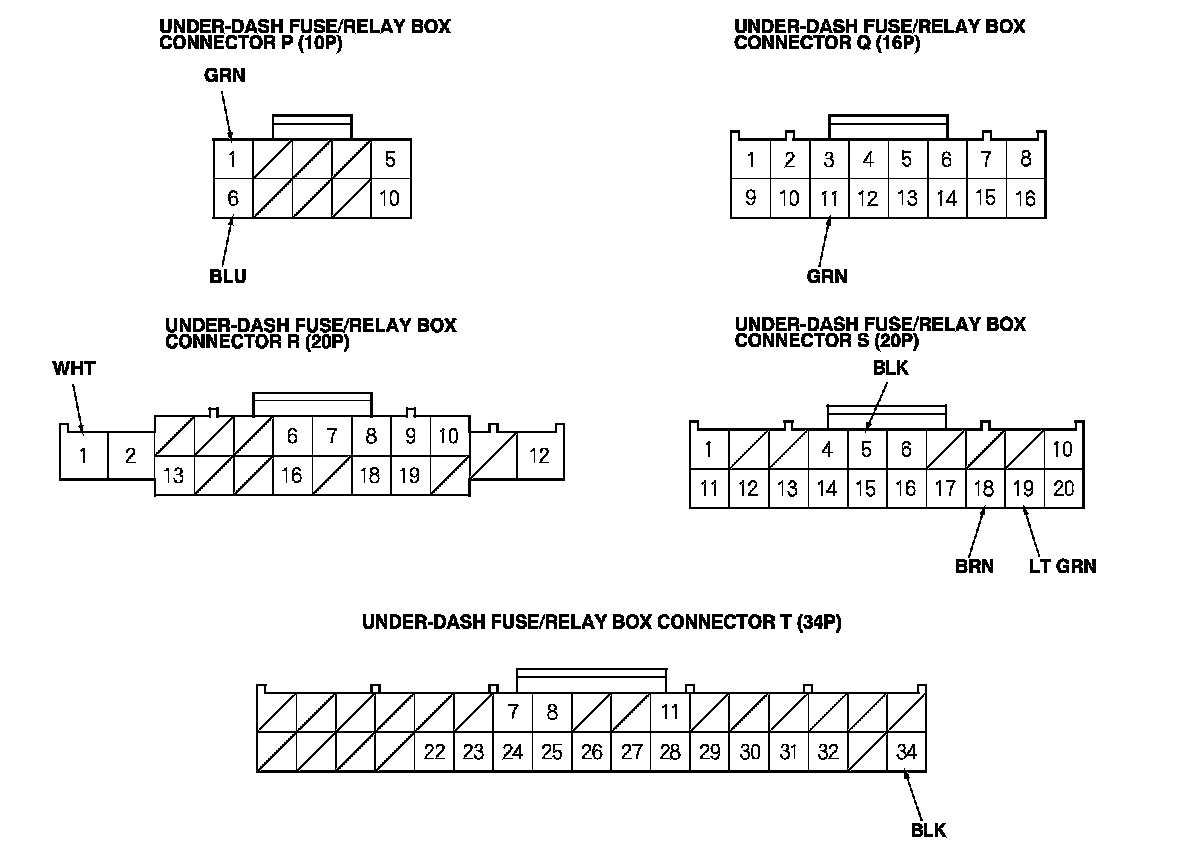 3. Disconnect under-dash fuse/relay box connectors E, F, G, P, Q, R, S, and T.