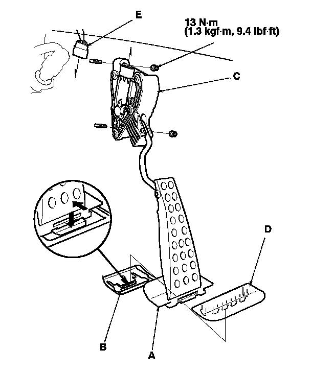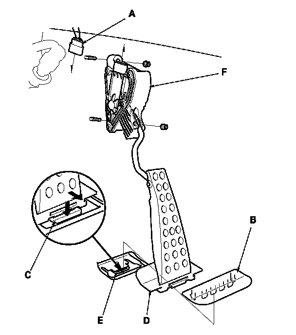 3. Push the tab (C), and remove the accelerator pedal pad (D) from the pedal stop (E).