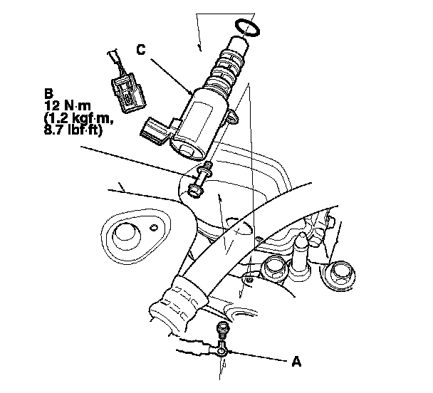 3. Remove the bolt (B) and the VTC oil control solenoid valve (C).