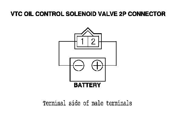 6. Connect the battery positive terminal to VTC oil control solenoid valve 2P connector terminal No. 2.