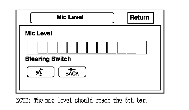 - Press the navigation TALK button on the steering wheel, wait unit you hear a beep, and in a normal voice say "testing." The TALK indicator on the screen should turn green, and the text Now Recording... should appear in yellow. If the talk indicator shown on the screen does not turn green, check the wiring from the steering wheel navigation TALK button to the audio-navigation unit. If there is no Mic Level movement when you speak, then you should check the wires running from the microphone in the roof console to the audio-navigation unit. If the wires are OK, the microphone must be faulty; replace the microphone located in individual map light. Service and Repair