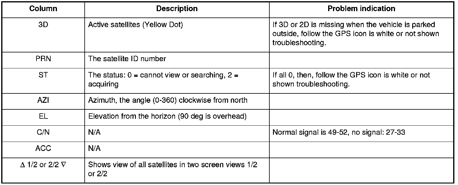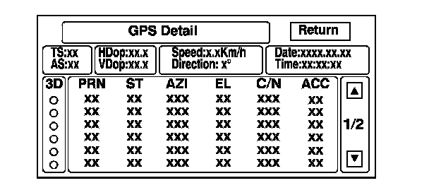By pressing and holding the MENU button for 2 seconds, a GPS Detail screen appears. This screen displays real time incoming satellite positional data when the vehicle is outside in the open. The information shown on this screen is for factory use.