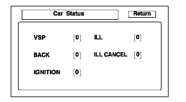 Use this screen to confirm that the audio-navigation unit is properly receiving input signals. Signals equal to (0) are OFF, and signals equal to (1) are ON. If the value on the display does not match the actual vehicle status, then check the wire carrying the signal.