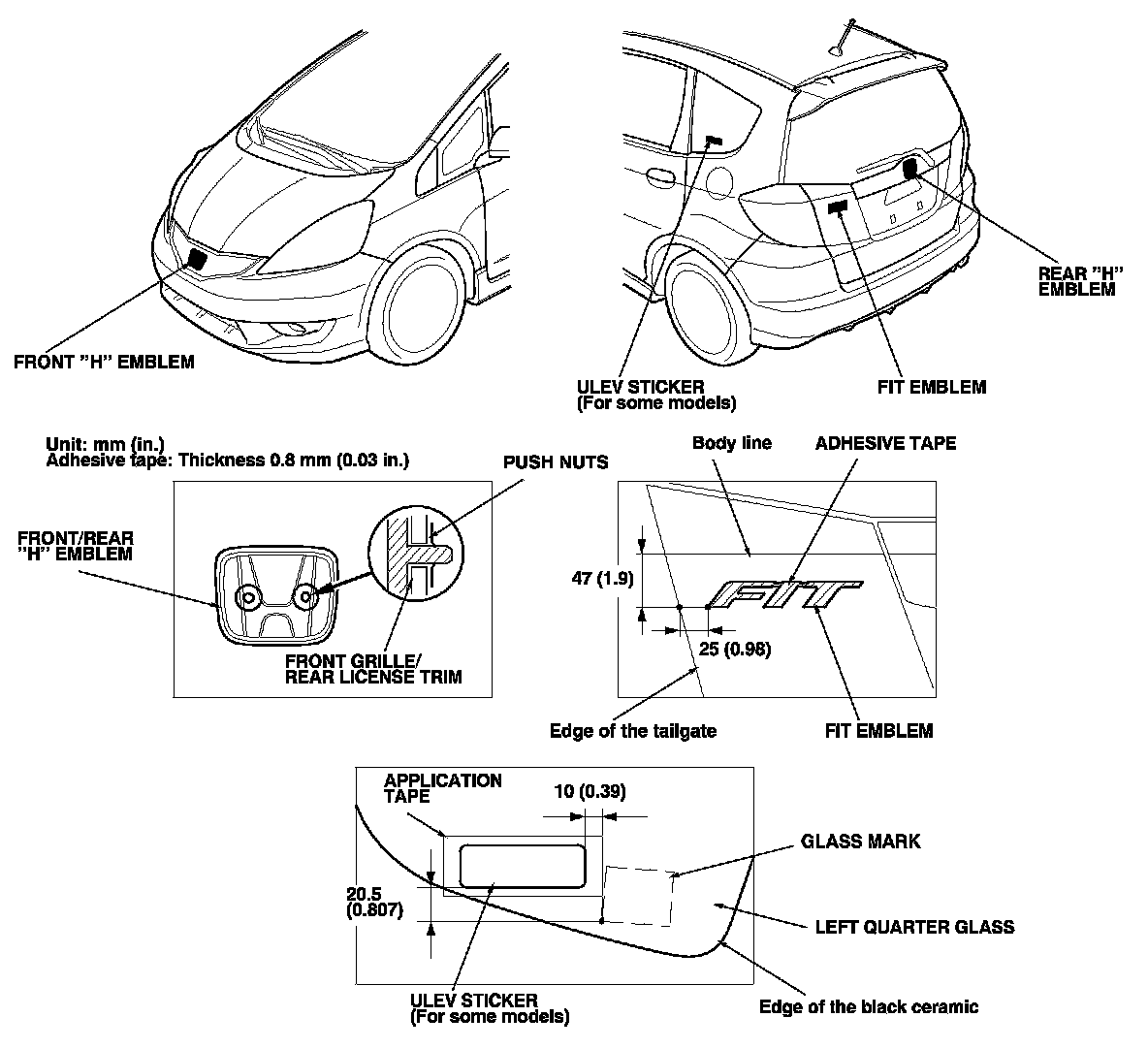 4. Apply the emblems/sticker where shown. When installing the ULEV sticker on the inside surface of the left quarter glass, align the sticker with the edge of the glass mark as shown, then press the sticker into place, and remove the application tape.