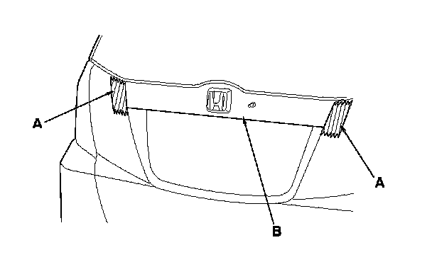 4. Apply protective tape (A) to the tailgate beside both side edges of the rear license trim (B) as shown.
