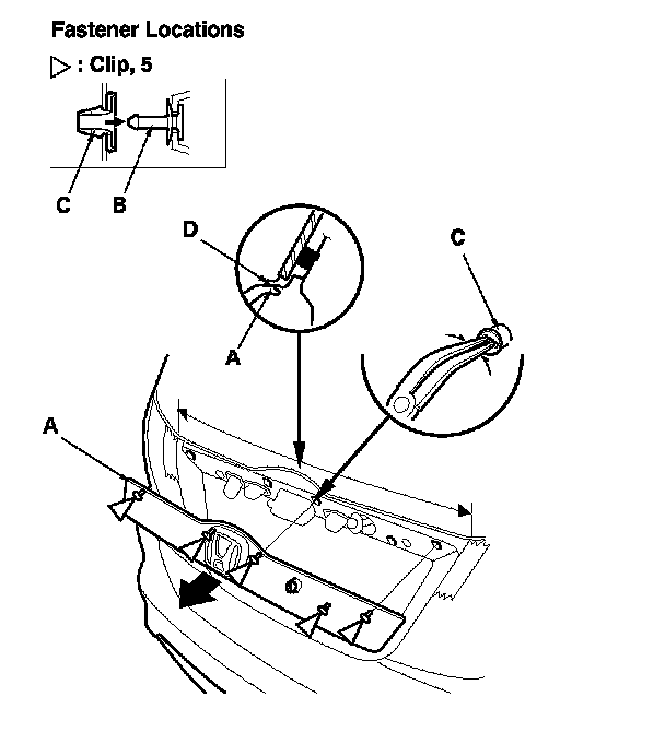 5. First insert the appropriate trim tool in the outside edge of the rear license trim (A), and pry the clip to detach the pin (B) of the clip from the grommet (C). Repeat an opposite side, and pull out the trim to detach the remaining three clips, then remove the trim.