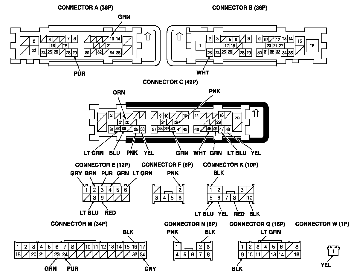 3. Disconnect under-dash fuse/relay box connectors A, B, C, E, F, K, M, N, Q, and W.