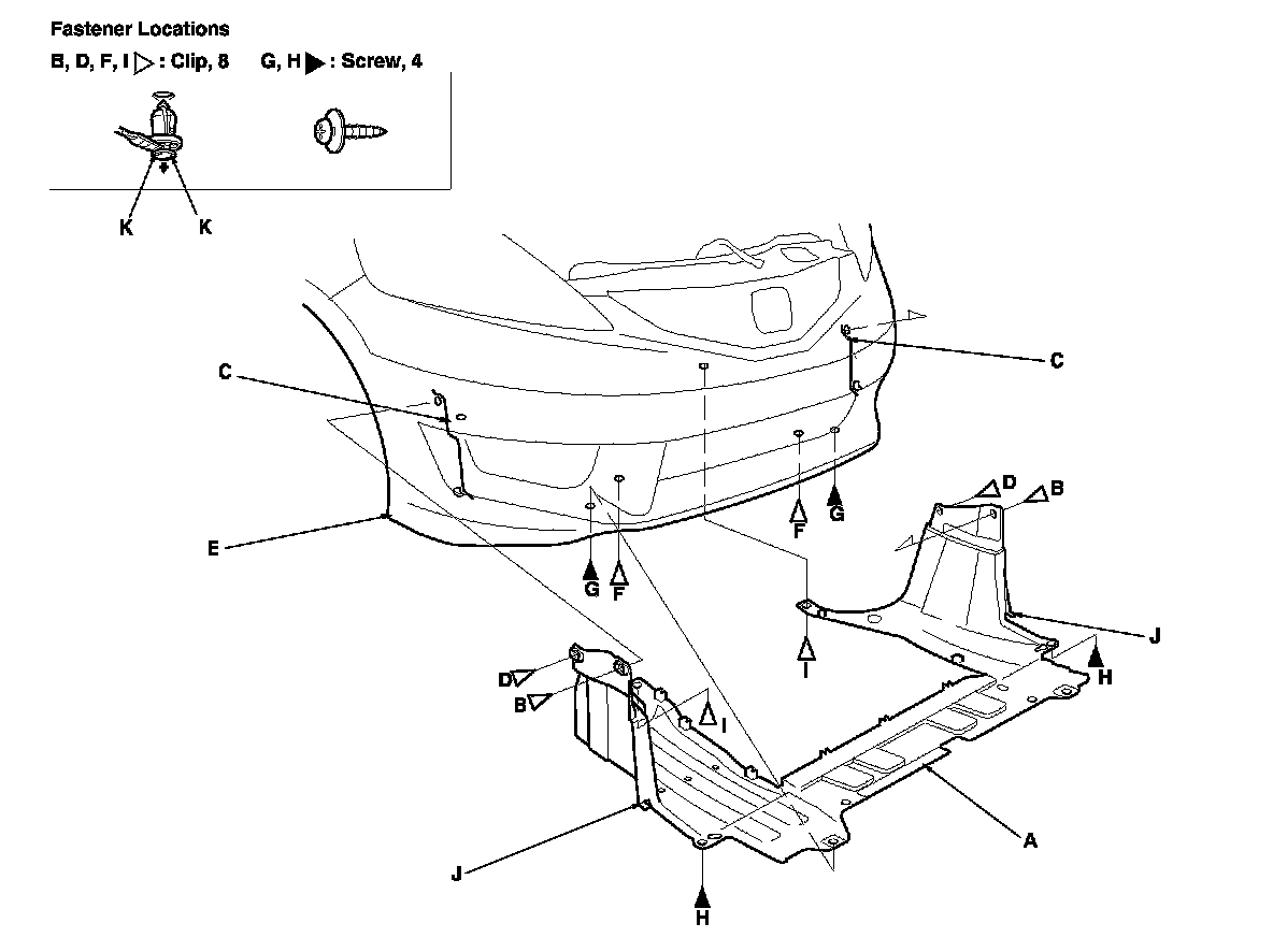 -3 From under the body, remove the screws (H) securing the front splash shield to the front inner fender, and the clips (I) securing the front splash shield to the front suspension subframe.