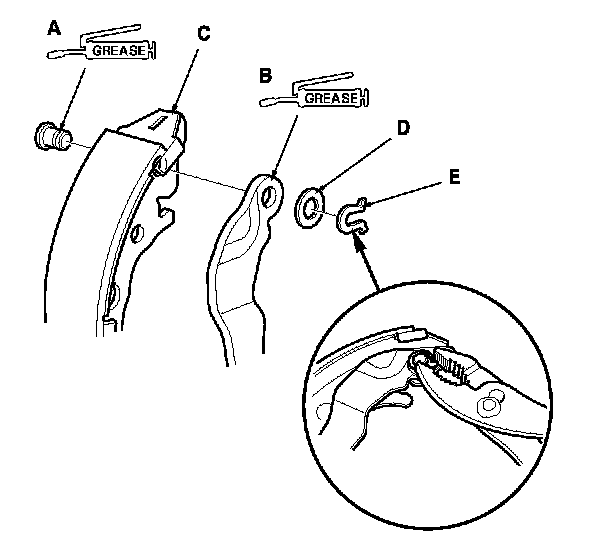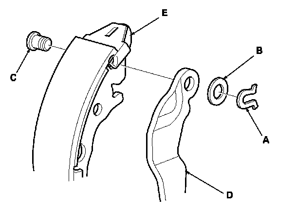8. Remove the U-clip (A), wave washer (B), and pivot pin (C), and separate the parking brake lever (D) from the brake shoe (E).