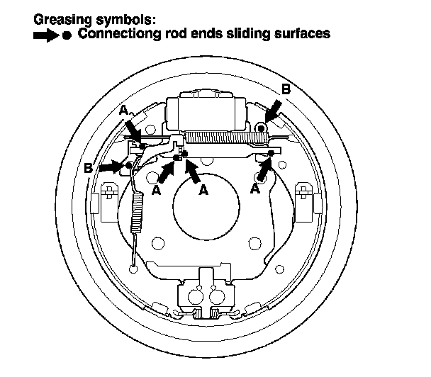 4. Apply a thin coat of Molykote 44MA grease to the connecting rod ends (A), and the sliding surfaces (B) as shown. Wipe off any excess. Keep grease off the brake linings.