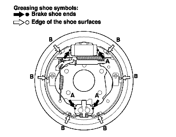 5. Apply a thin coat of Molykote 44MA grease to the shoe ends (A) and the edge of the shoe surfaces (B) that contact the backing plate as shown. Wipe off any excess. Keep grease off the brake linings.