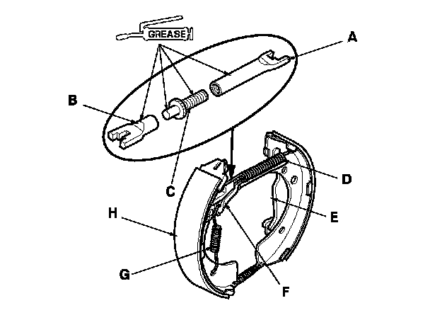 1. Apply Molykote 44MA grease to the sliding surface of the pivot pin (A) and parking brake lever (B) for the rearward brake shoe (C).
