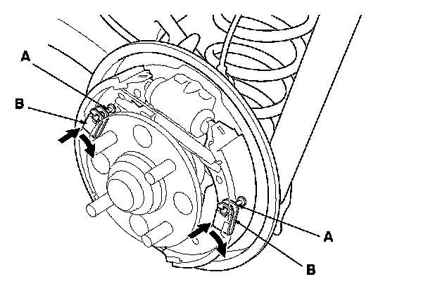 5. Remove the lower return spring (A), and remove the brake shoe assembly over the hub.
