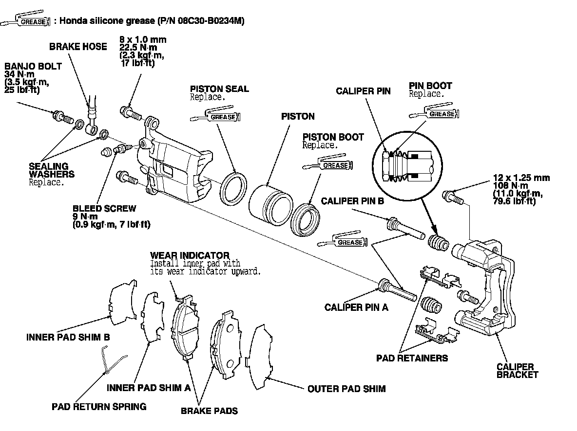 NOTE: Make sure that the caliper pins are installed correctly. Upper caliper pin B and lower caliper pin A are different. If these caliper pins are installed in the wrong location, it will cause vibration, uneven or rapid pad wear, and possibly uneven tire wear.