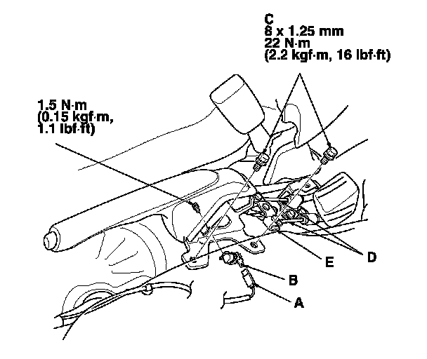 4. Remove the parking brake lever mount bolts (C).
