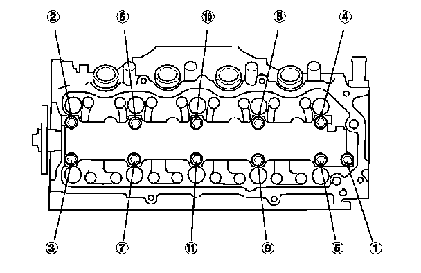 3. Unscrew the rocker shaft mounting bolts two turns at a time in sequence shown.