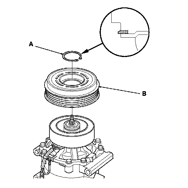 3. If you are replacing the field coil, remove the snap ring (A) with snap ring pliers, then remove the rotor pulley (B). Be careful not to damage the rotor pulley or the A/C compressor.