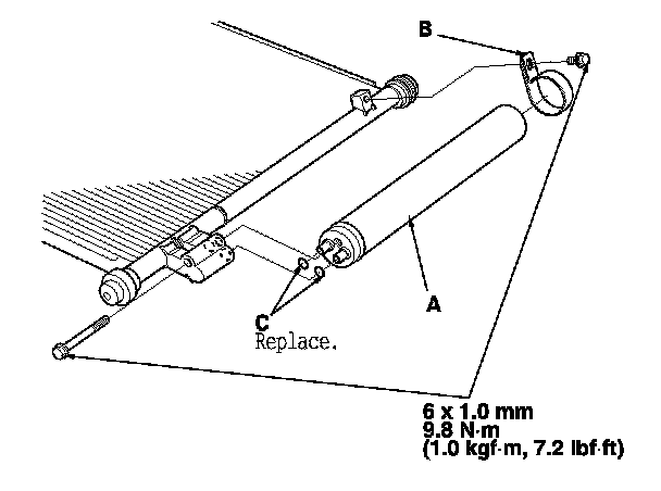 2. Remove the bolts from the A/C condenser, then remove the receiver/dryer (A), the bracket (B), and the O-rings (C).