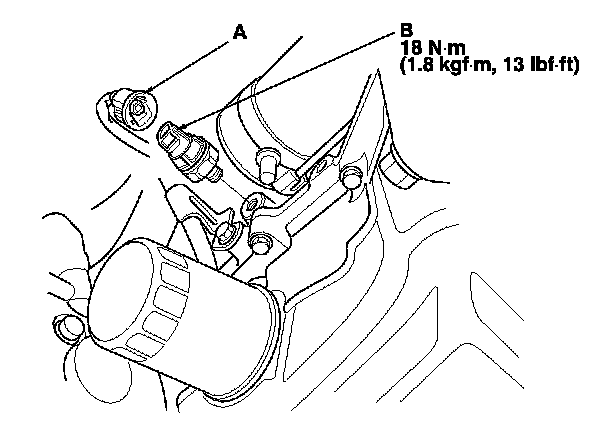 1. Disconnect the oil pressure switch connector (A), then remove the oil pressure switch (B).