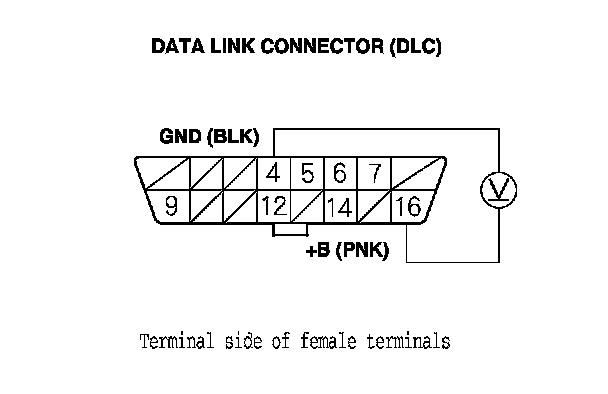 28. Measure the voltage between DLC terminal No. 16 and body ground.