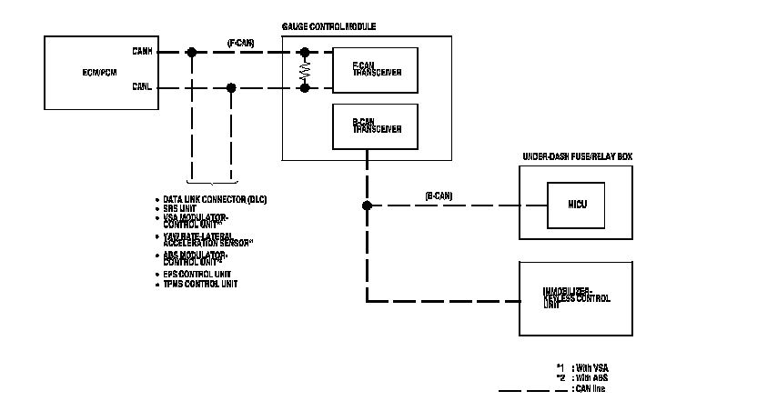 The body controller area network (B-CAN) and the fast controller area network (F-CAN) share information between multiple electronic control units (ECUs). B-CAN communication moves at a slower speed (33.33 kbps) for convenience related items and for other functions. F-CAN information moves at a faster speed (500 kbps) for "real time" functions such as fuel and emissions data. To allow both systems to share information, the gauge control module translates information from B-CAN to F-CAN and from F-CAN to B-CAN.
