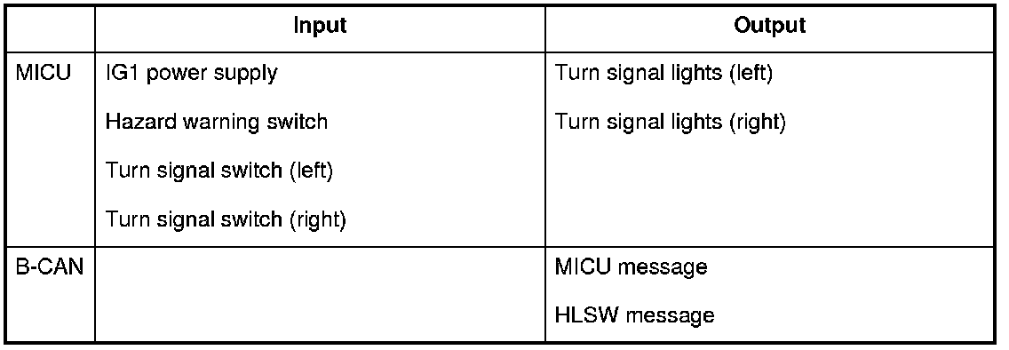 The MICU control of the turn signal/hazard warning lights is based on input signals from the turn signal switch and the hazard warning switch.