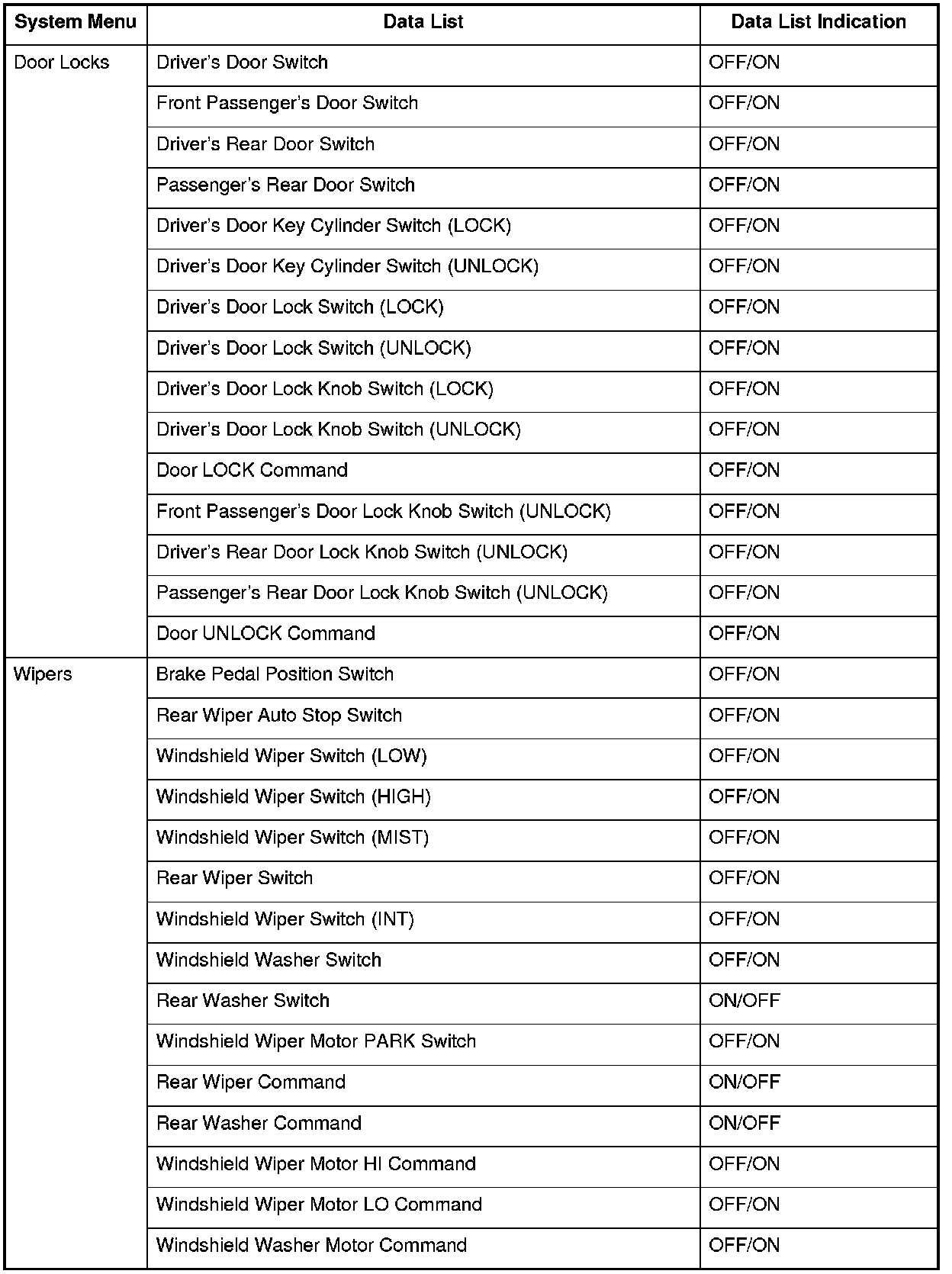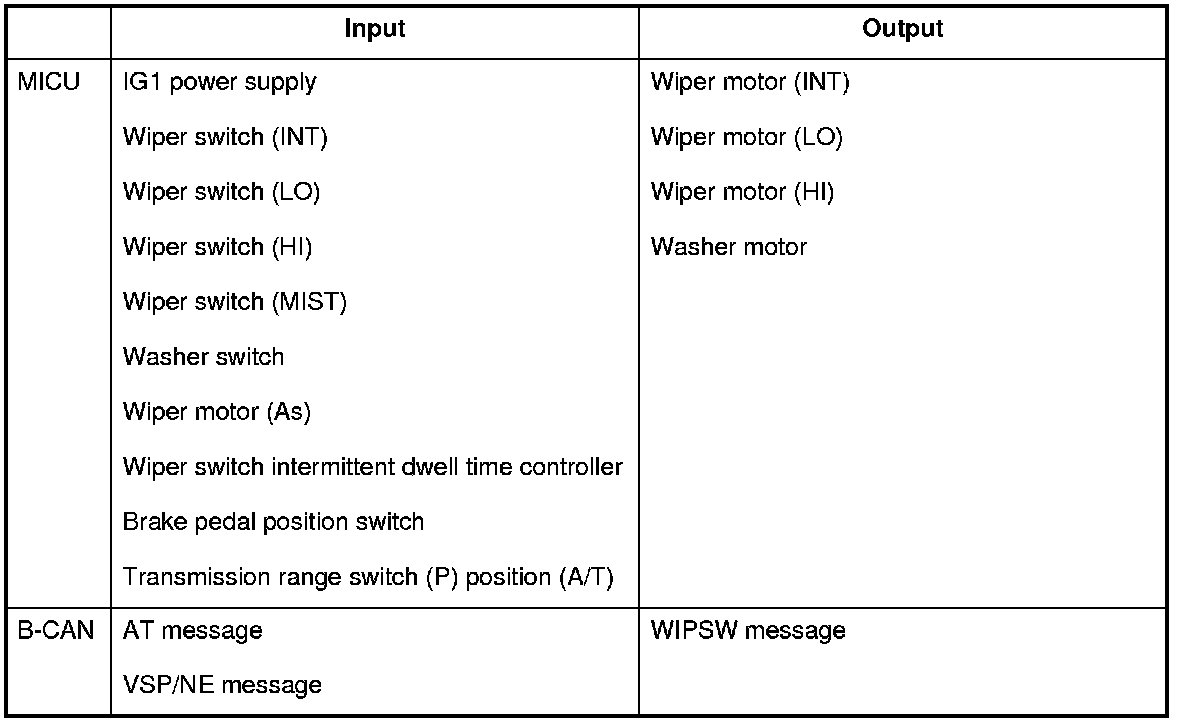 The MICU control of the wiper is based on input signals from each switch and B-CAN signals.