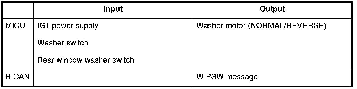 The MICU control of the rear window wiper motor and washer motor is based on input signals from each switch.