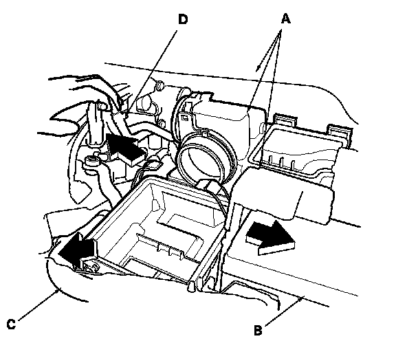 4. Remove the battery hold down, and reposition the battery (B). Reposition the radiator upper hose (C), and the breather pipe (D) as shown.