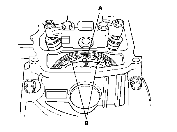 2. Set the No. 1 piston at top dead center (TDC). The "UP" mark (A) on the camshaft sprocket should be at the top, and the TDC grooves (B) on the camshaft sprocket should line up with the top edge of the head.