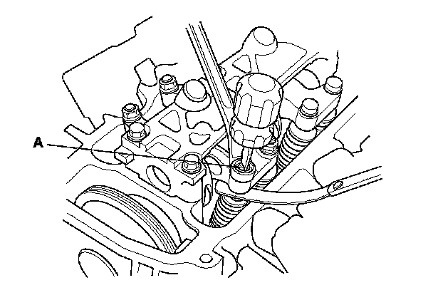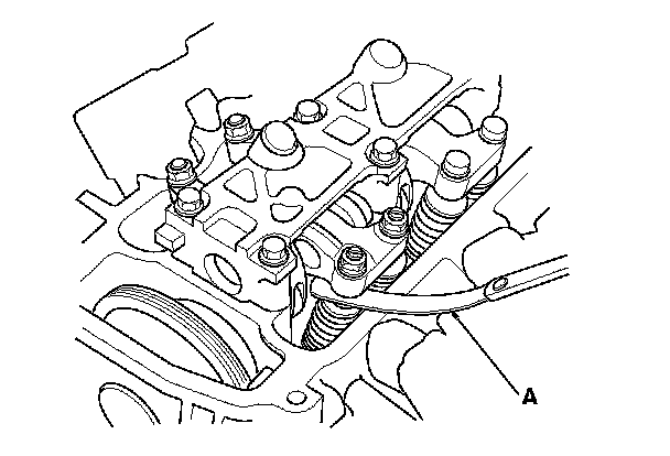 4. Insert the feeler gauge (A) between the adjusting screw and the end of the valve stem on No. 1 cylinder and slide it back and forth; you should feel a slight amount of drag.