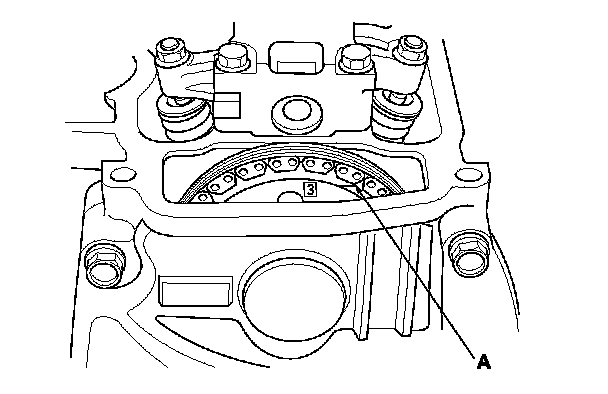8. Rotate the crankshaft clockwise. Align the No. 3 piston TDC groove (A) on the camshaft sprocket with the top edge of the head.