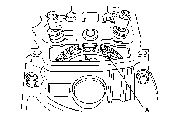 10. Rotate the crankshaft clockwise. Align the No. 4 piston TDC groove (A) on the camshaft sprocket with the top edge of the head.