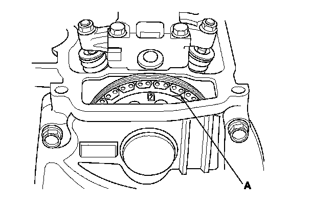 12. Rotate the crankshaft clockwise. Align the No. 2 piston TDC groove (A) on the camshaft sprocket with the top edge of the head.