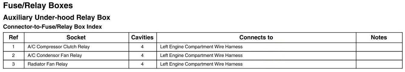 Auxiliary Under-Hood Relay Box - Connector-to-Relay Box Index