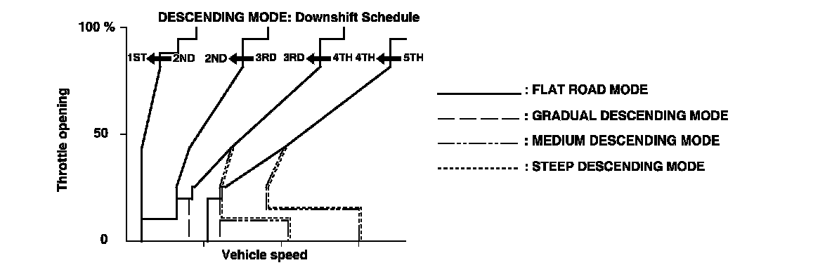 When the PCM determines that the vehicle is going down a hill in D, D3 (seven-position transmission), and S with automatic shift mode (five-position transmission), the upshift speed from 4th to 5th gear, 3rd to 4th gear, and from 2nd to 3rd (when the throttle is closed) becomes higher than the set speed for flat road driving to extend the 4th gear, 3rd gear, and 2nd gear driving areas. This, in combination with engine braking from the deceleration lock-up, achieves smooth driving when the vehicle is descending. There are three descending modes with different 4th gear driving areas, 3rd gear driving areas, and 2nd gear driving areas, according to the steepness of the grade, stored in the PCM. When the vehicle is in 5th or 4th gear and you are decelerating while applying the brakes on a steep hill, the transmission downshifts to a lower gear. When you accelerate, the transmission then returns to a higher gear.