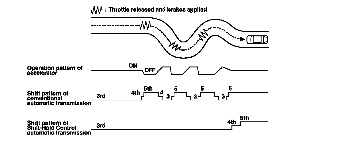 When negotiating winding roads, the throttle is suddenly released and the brakes are applied, as is the case when decelerating at the entrance of a corner, Shift-Hold Control keeps the transmission in its current (lower) gear as it negotiates the corner and accelerates out.