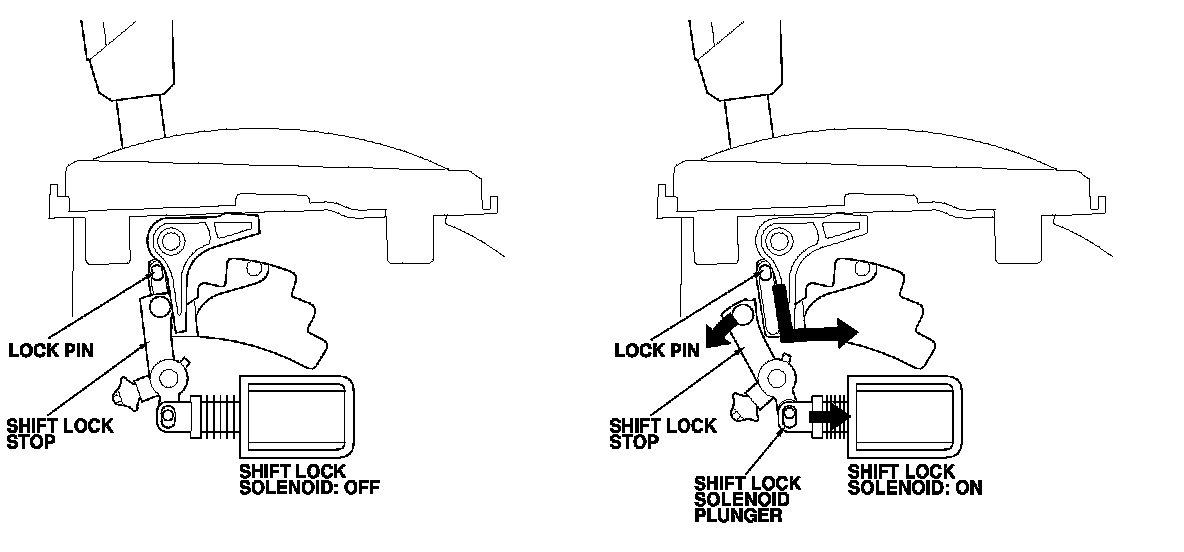 In P without pressing the brake pedal or while pressing the accelerator, the shift lock solenoid remains OFF, and the shift lever cannot be shifted out of P because the shift lock stop stops the lock pin. However while the brake pedal is pressed and the accelerator is released, the shift lock solenoid is turned ON, and the shift lock solenoid plunger is retracted, releasing the shift lock stop. Pushing the shift lever button passes the lock pin through the shift lock stop, and allows the shift lever to be shifted out of P.