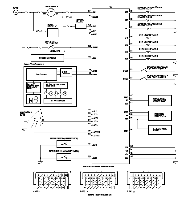 The PCM receives input signals from the various sensors and switches, processes the data, and outputs current to A/T clutch pressure control solenoid valves A, B, and C.